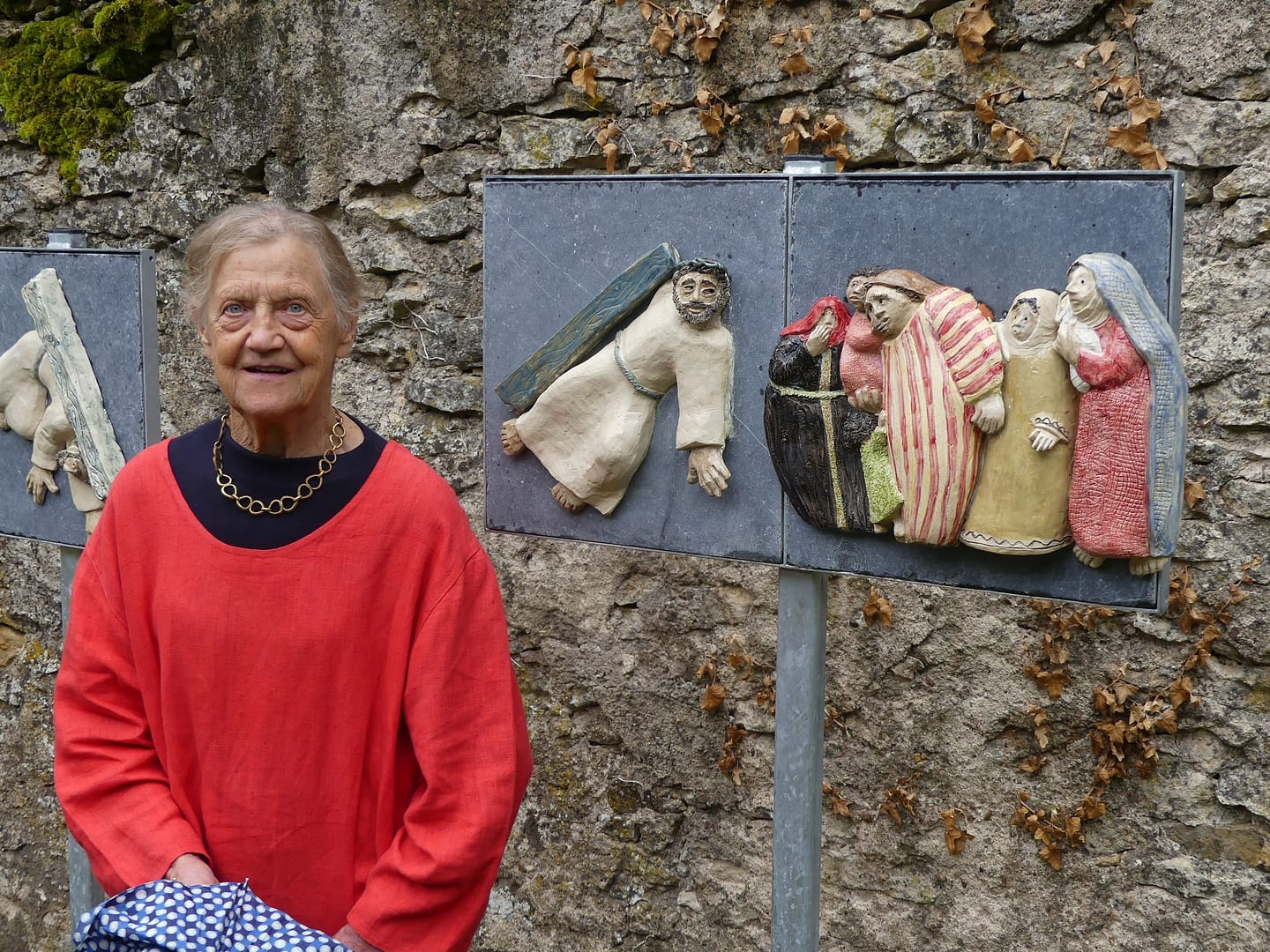 C’est en nous investissant au Foyer Carré de Malberg que nous avons appris à connaitre la figure de Caroline Carré. Il est apparu très vite qu’elle était très attachée à cette maison et que le parc était pour elle un lieu de ressourcement et de prière. A son époque, il était peuplé de nombreuses statues religieuses. Il était donc important de lui redonner cette dimension et est venu l’idée d’un chemin de croix. D’après une habitante âgée du village, l’idée avait déjà germé il y a de nombreuses années mais sans aboutir. La providence s’est entêtée et a œuvré à la réussite de ce projet. Une très généreuse mécène nous a fait le don nécessaire et nous avons rencontré au hasard d’une exposition d’art sacré en Belgique, Sabine de Coune,